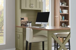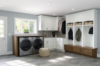 Dover maple Castle Rock Sheer, oak Cottage White Sheer accents, boot bench in maple Gingersnap